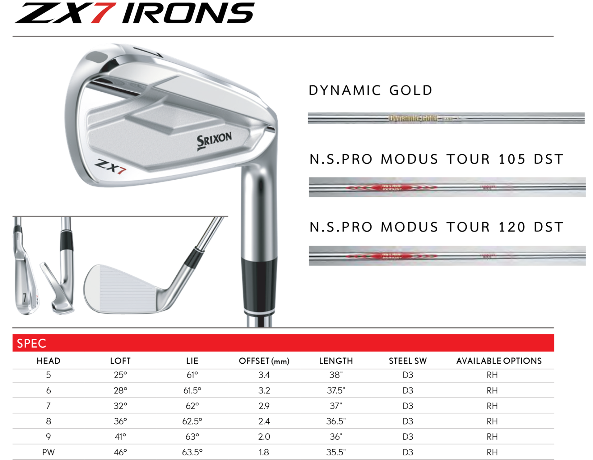 ZX7 เป็นการออกแบบใบเหล็กด้วยการขึ้นรูปเป็นชิ้นเดียว ซึ่งมีลักษณะเหมือนกับใบมีดที่มีความกะทัดรัด พร้อมกับบริเวณสันด้านบนและ Sole ที่แคบลง พร้อมมอบความรู้สึกที่นุ่มนวลและความเร็วที่เพิ่มขึ้น อีกทั้งยังสามารถควบคุมการตีลูกได้ดียิ่งขึ้น สัมผัสสุนทรียภาพของชุดเหล็กระดับโลกได้ใน Srixon ZX7